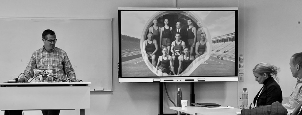 I’m currently at work on a cultural history of the football helmet. I’ve presented my helmet research at multiple conferences, as well as via invitation to the University of Iowa and Notre Dame.